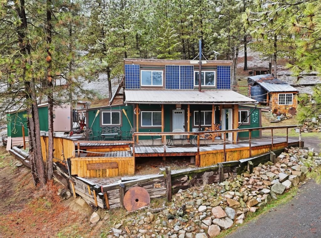 Private 16 acres with year-round creek, canyon views, and established off-grid systems in place. Set in a canyon with two other off-grid neighbors, it offers privacy within a like-minded setting. This 860 SF cabin blends sustainability and adventure. A large wraparound deck expands outdoor living, while a rope bridge, 4×4 and hiking trails, and a 200’ zipline create an outdoor playground. In winter, cozy up to the woodstove and enjoy movies powered by 3,700 watts of solar with updated wiring and newer batteries. The cabin is wired for both 12V and 120 and supported by an inverter generator. Systems include a 1,700-gallon buried rainwater cistern and 2,000-gallon holding tank for irrigation and animals, plus on-demand hot water. Bathroom features a full bath and is wired for composting toilet. East-facing garden with organically amended soil, established orchard, greenhouse, barn, duck pond, hutches, brooder, covered run, and multiple enclosures complete this homestead.